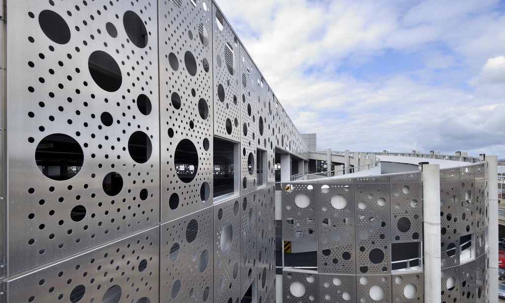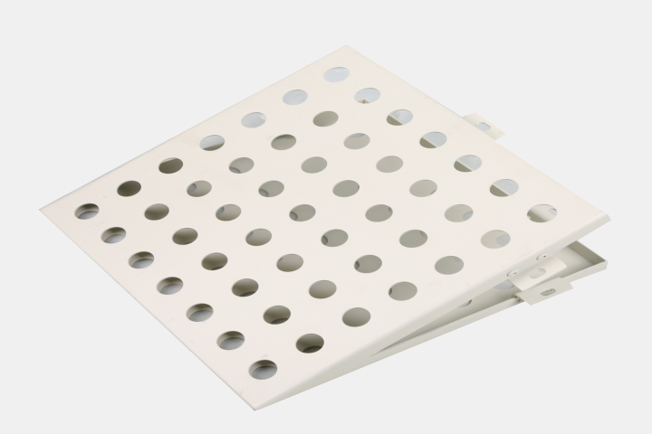 時尚與個性并存,富有藝術特色。配以不同顏色和形狀各異的沖孔,則會則會營造出獨特的氛圍,更會提升建筑的層次感和現代感。沖孔板一般采用優質1100、3003、5005單層鋁合金板為基材。表面涂層分為氟碳噴涂,粉末噴涂,聚酯漆噴涂。鋁板表面涂層性質嚴格按客戶要求,顏色可由公司負責提供標準色卡供客戶選擇。沖孔鋁單板產品厚度主流的有1.5mm、2.0mm、2.5mm、3.0mm、4.0mm等各種規格,成型鋁單板更大尺寸可達1500x4000mm。單層鋁合金幕墻板的結構主要由面板、加強筋、掛耳等部件組成。加工好的氟碳涂層板材01構造 由上至下依次為:保護膜層、氟碳樹脂PVDF系統(三涂時由上至下分別為光漆、面漆、底漆)、預處理層、鋁板層、預處理層、背覆涂層(雙面噴涂)。根據客戶要求,鋁板背面可配合添加礦棉、巖棉以達到增強保溫、隔熱和隔音等效果。